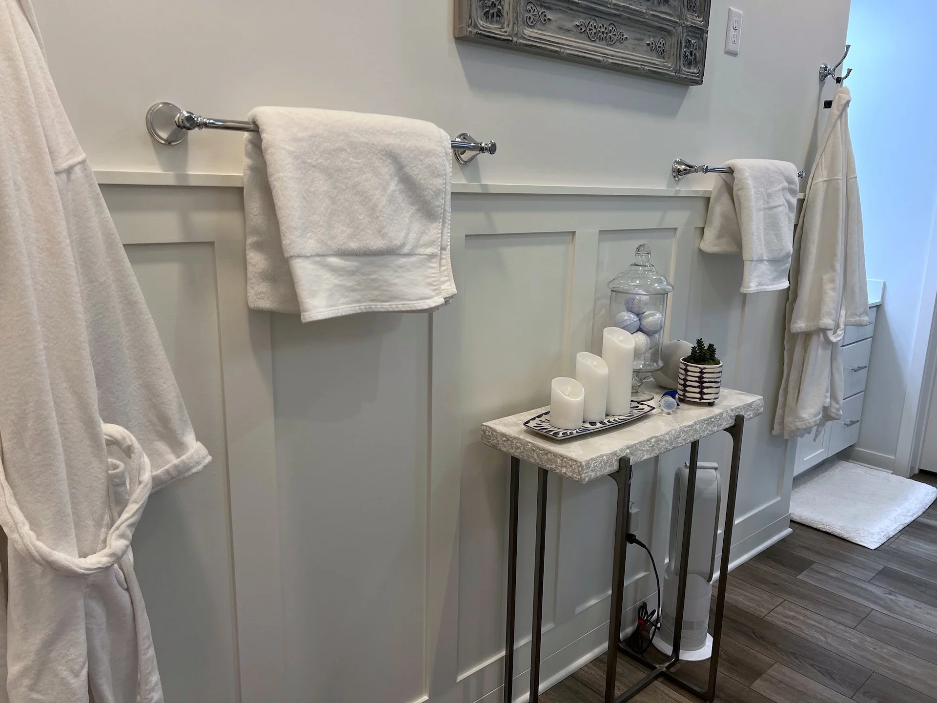 Wainscoting has been beautifully installed in both the primary bedroom and the bathroom, adding an elegant touch and enhancing the overall aesthetic of the interior design. This addition not only improves the look of the spaces but also contributes to a sense of warmth and sophistication.